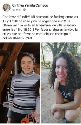 PEDIDO DE PARADERO DE JOVEN DESAPARECIDA EN VILLA GIARDINO