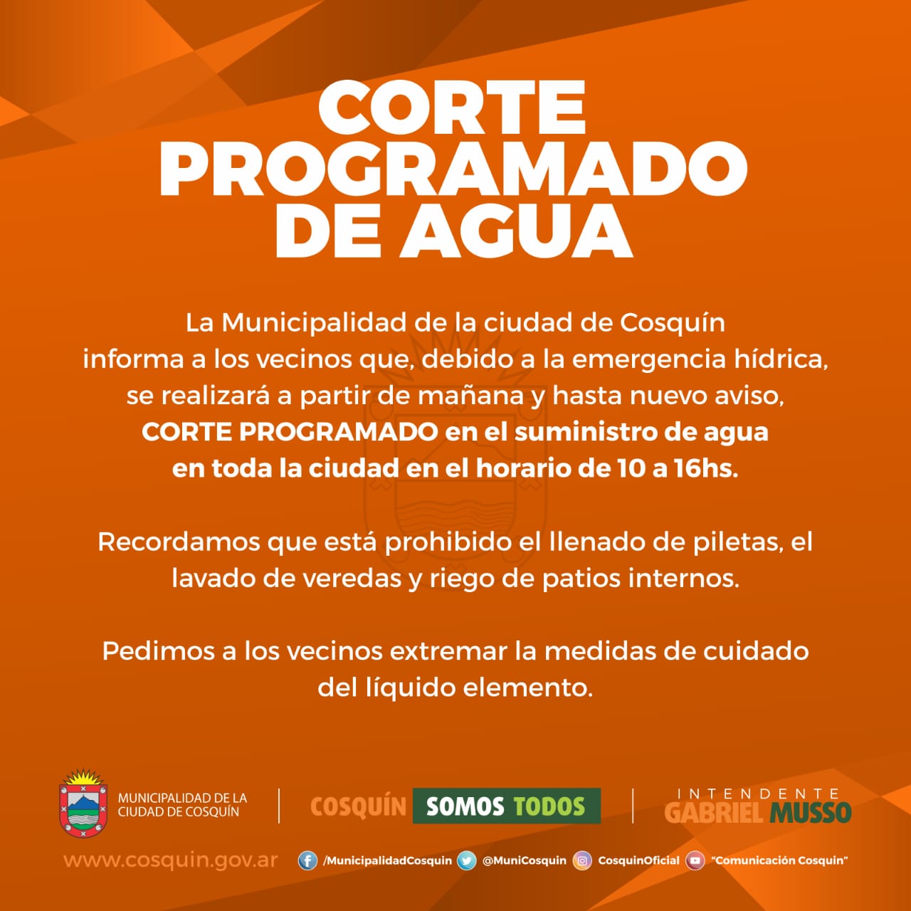 POR LA EMERGENCIA HÃDRICA INICIAN CORTES DE AGUA DIARIOS EN COSQUÃN