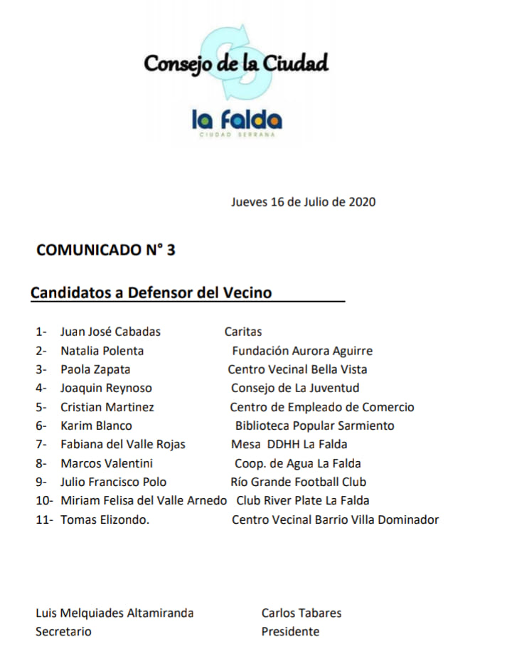 Se dieron a conocer los candidatos para el Defensor del vecino en La Falda